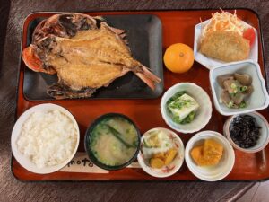 諦められず、お土産コーナーのおばちゃんに、事情を話し、金目鯛が食べられるお店を教えて欲しいと懇願しました。すると、「干物を買ってくれたら素揚してもらえるように軽食店に頼んであげるよ」と言って下さるではありませんか。正直に、「定食で食べたい」と伝えると、「いいよ、奥の休憩所で待ってて。定食にして持っていくから」と信じられない優しい言葉が返ってきました。