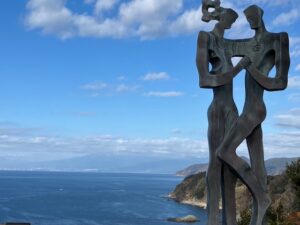 車中泊で利用した駿河湾沼津SAでは、エリアコンシェルジュの方に、景色が良く愛犬とゆっくり散策できる場所について聞いてみました。このコーナーには、富士山・ワンコ・お茶カフェ・モデルコースなど、カテゴリー別に整理した資料が用意されていました。その中から、土肥温泉の恋人岬を勧めてくれました。おかげで、大好きな海を眺めながら、愛犬とゆっくり散策できました。富士山は雲に隠れていましたが、雪を頂いた白い頭だけが顔を出し、静岡らしい景色を味わえました。